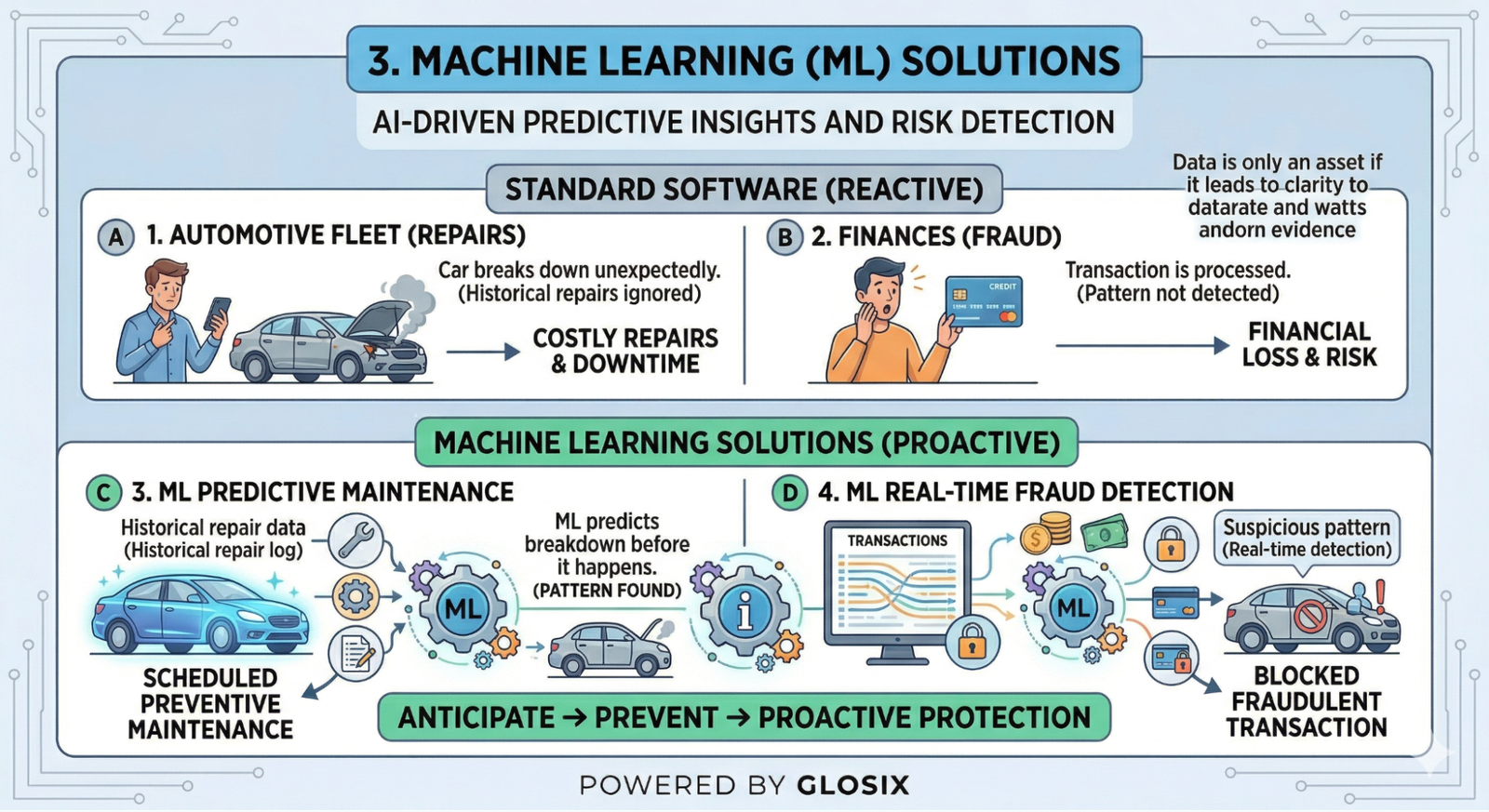 While standard software reacts to what has happened, Machine Learning allows you to anticipate what will happen. We develop custom ML models that find patterns in your data to prevent costly mistakes. For automotive fleets, our models analyze historical repair data to predict when a vehicle is likely to break down before it actually does. In financial modules, we implement real-time fraud detection that identifies suspicious transaction patterns instantly. This proactive approach saves thousands in repair costs and protects your business from financial risk.