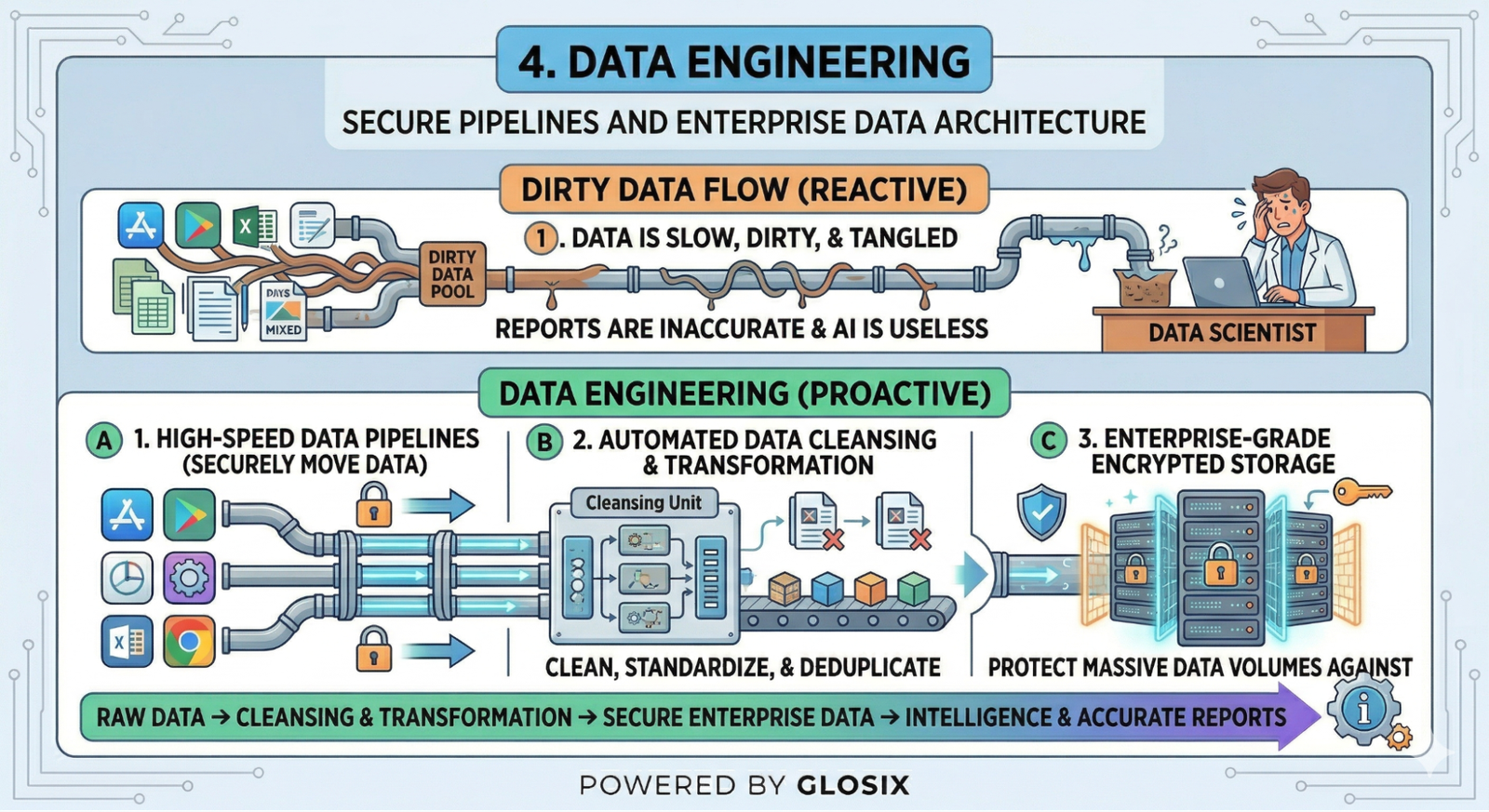 Even the most advanced AI is useless if the data feeding it is “dirty” or slow. Data Engineering is the invisible plumbing that makes intelligence possible. We design high-speed Data Pipelines that move information securely from your apps to your databases. We implement automated “cleansing” processes to remove duplicates and errors, ensuring that your reports are always accurate. By setting up enterprise-grade, encrypted storage solutions, we ensure that your massive volumes of data are not only accessible but fully protected against loss or breach.
