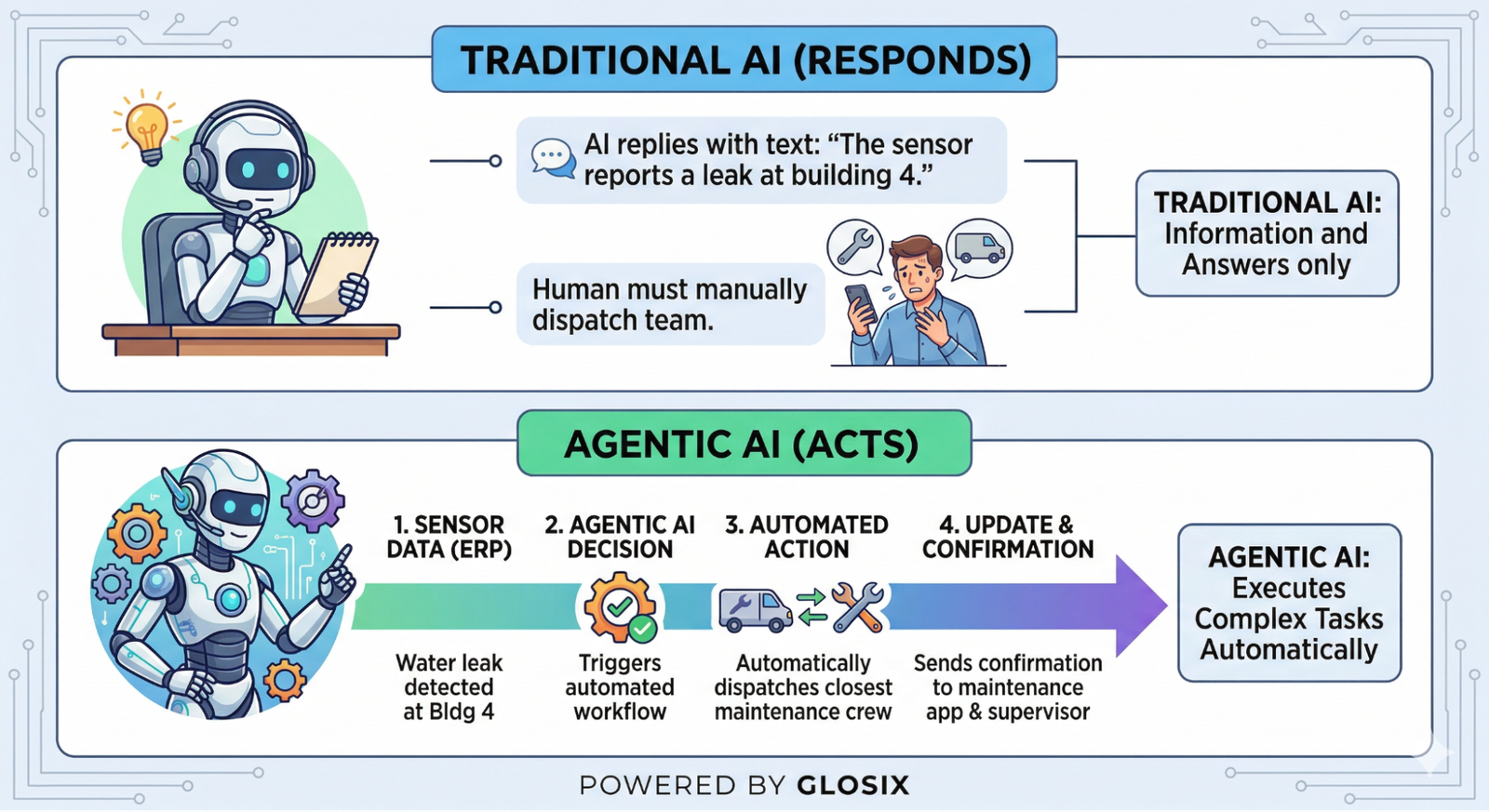 Traditional AI answers questions; Agentic AI performs actions. At Glosix, we develop autonomous AI agents that integrate directly into your business processes. These agents are designed to monitor your ERP data, identify triggers, and execute complex tasks without human intervention such as automatically dispatching a maintenance crew when a property sensor flags a leak or managing car rental extensions by verifying insurance and payment status. This shifts your team from “doing” to “supervising,” drastically increasing operational throughput.