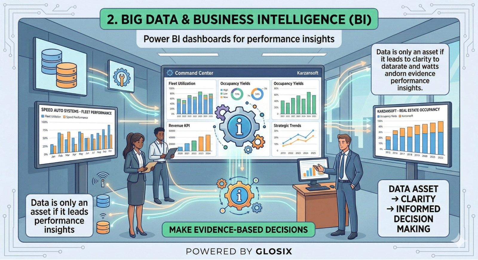 Data is only an asset if it leads to clarity. Our Business Intelligence services focus on aggregating fragmented data from across your enterprise into a single, visual “Command Center.” We build custom dashboards that allow stakeholders to see real-time KPIs such as fleet utilization rates for Speed Auto Systems or occupancy yields for Karzansoft. By transforming millions of rows of data into intuitive visualizations, we empower your leadership to make evidence-based decisions that drive profitability.